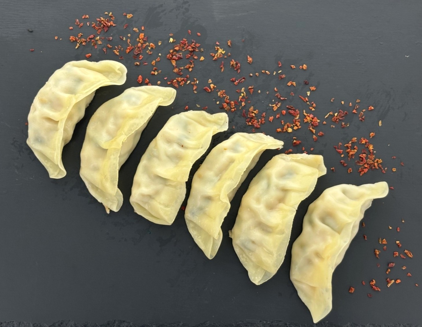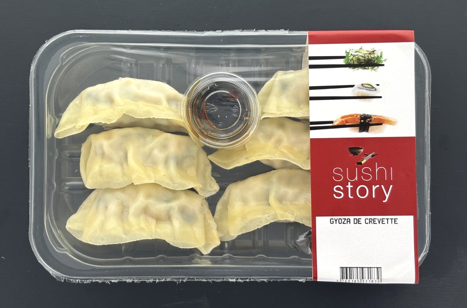 6 Gyoza aux crevettes cuits accompagnés d’une sauce Teriyaki.