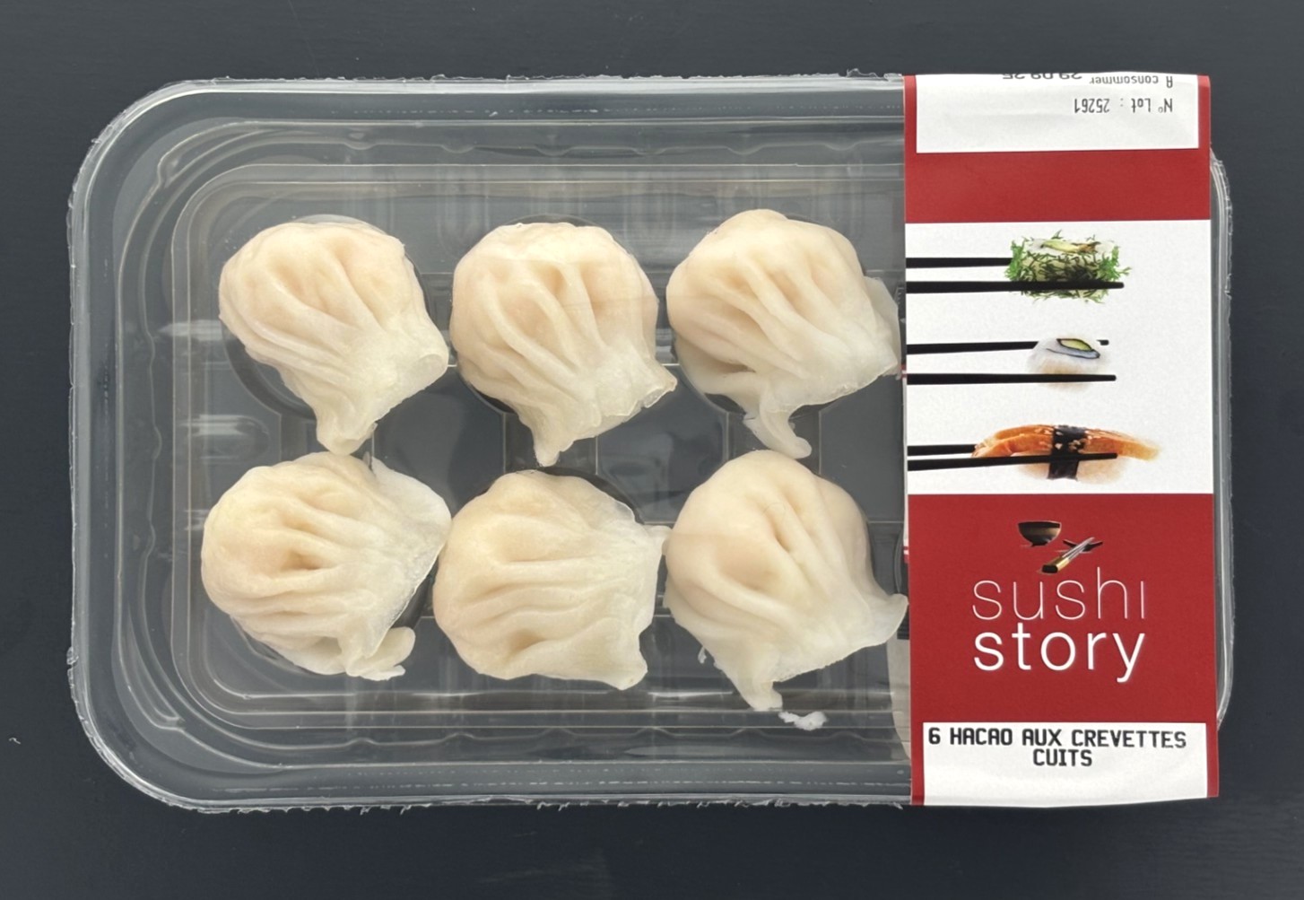 6 hacao cuits aux crevettes 150 g : CREVETTE 34% (Penaeus vannamei élevée au Vietnam), eau, amidon de BLE (contient GLUTEN), pousses de bambou, huile de SOJA raffinée, amidon de tapioca, sucre, huile de SESAME, sel, extraits de levure, poivre blanc.