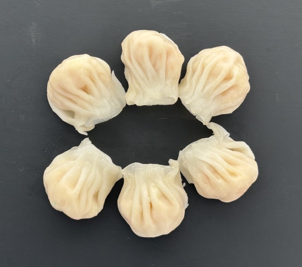 6 Hacao aux crevettes cuits accompagnés d’une sauce soja.