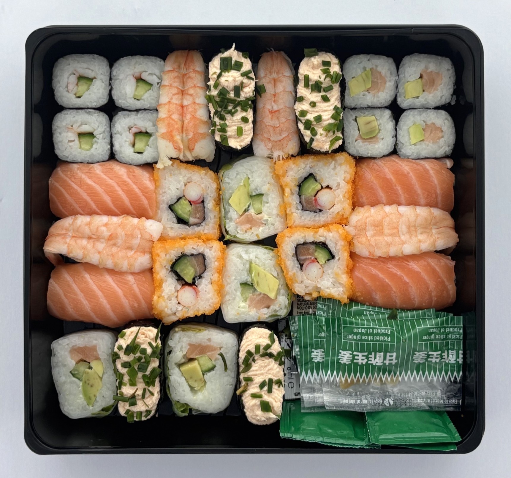 Sushis 28 pièces : 4 nigiri crevette – 4 nigiri gunkan saumon cuit ciboulette – 4 maki saumon avocat – 4 maki crevette concombre – 4 california-roll saumon concombre surimi masago – 4 springroll au saumon – 4 nigiri saumon – 4 dosettes de sauce soja – 4 sachets de wasabi – 4 sachets de gingembre.
