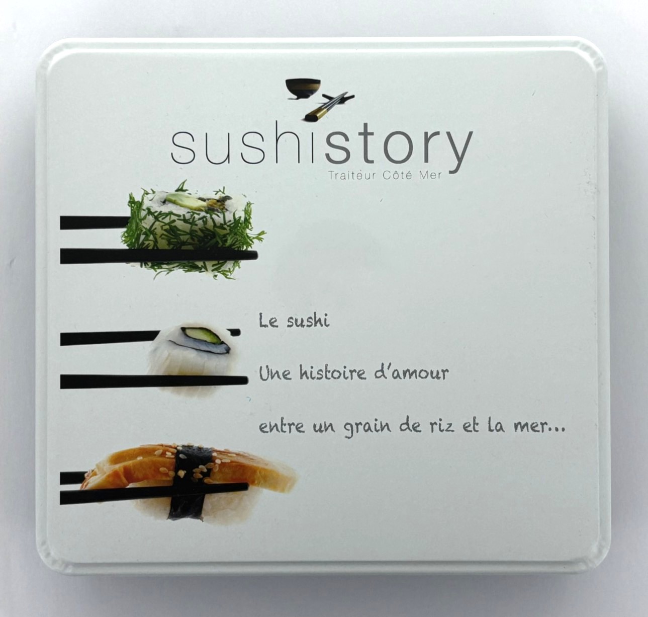 SUSHI Poids net 748 g : Riz préparé cuit 70% (eau, riz, vinaigre de riz, sucre, tréhalose (source de glucose), sel), SAUMON atlantique 13% (Salmo salar), CREVETTE cuite 4.3% (CREVETTE, sel), concombre 3.3%, avocat 2.3% (avocat, antioxydant : acide ascorbique, acidifiant : acide citrique, sel), galette de riz (farine de riz, tapioca, eau, sel), mayonnaise (huile de colza, eau, jaune d’ŒUF, vinaigre, sel, sucre, amidon modifié de pomme de terre, acidifiant : acide lactique, épaississants : gomme de guar et gomme xanthane, colorant : lutéine, arôme), surimi 1.3% (Surimi 41% (chair de poisson, stabilisant : sucre), eau, poudre de blanc d’oeuf réhydratée (de poules élevées en plein air), amidon (contient du blé), huile de colza, antioxydant : lactate de sodium, amidon modifié, sucre, sel, arômes (contient des crustacés), régulateur d’acidité : glucono-delta-lactone, colorant: lycopène, conservateur : sorbate de potassium), salade, ciboulette, nori (algues séchées), masago (œufs de CAPELAN, sel, sucre, mirin (alcool de riz), sauce soja (eau, SOJA, BLÉ, sel), épices, colorant: jaune orangé S (peut avoir des effets indésirables sur l’activité et l’attention chez les enfants), sel.